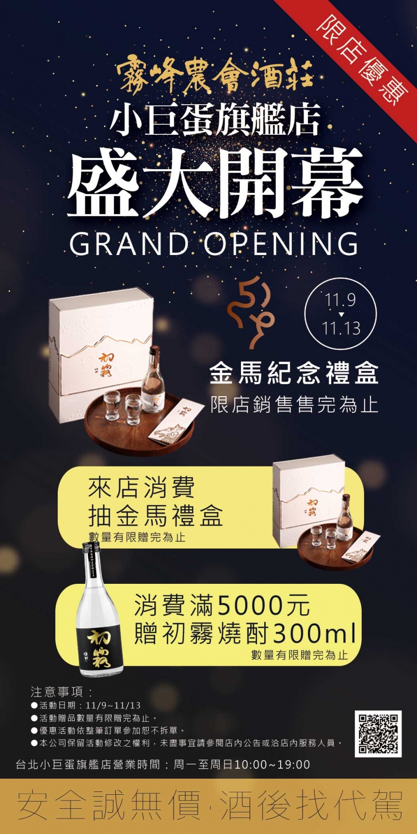 霧峰區農會甫於10月獲選的金馬獎燒酎聯名禮盒一發表立即造成搶購,農會特別保留了50組金馬獎禮盒提供給北部民眾在旗艦店購買品嚐或收藏。旗艦店開幕期間還特別祭出優惠活動,凡於11月9日至13日在霧峰區農會酒莊台北小巨蛋旗艦店不限金額消費,即可參加抽獎活動,獎品包括金馬獎禮盒、荔枝蜂蜜酒、初霧清酒紀念杯等豐富好禮,數量有限送完為止。另外,前100名單筆消費滿5000元,再加碼贈送300ml初霧燒酎乙瓶,喜歡優質酒品與農特產品的北部民眾可以搶先嚐鮮。