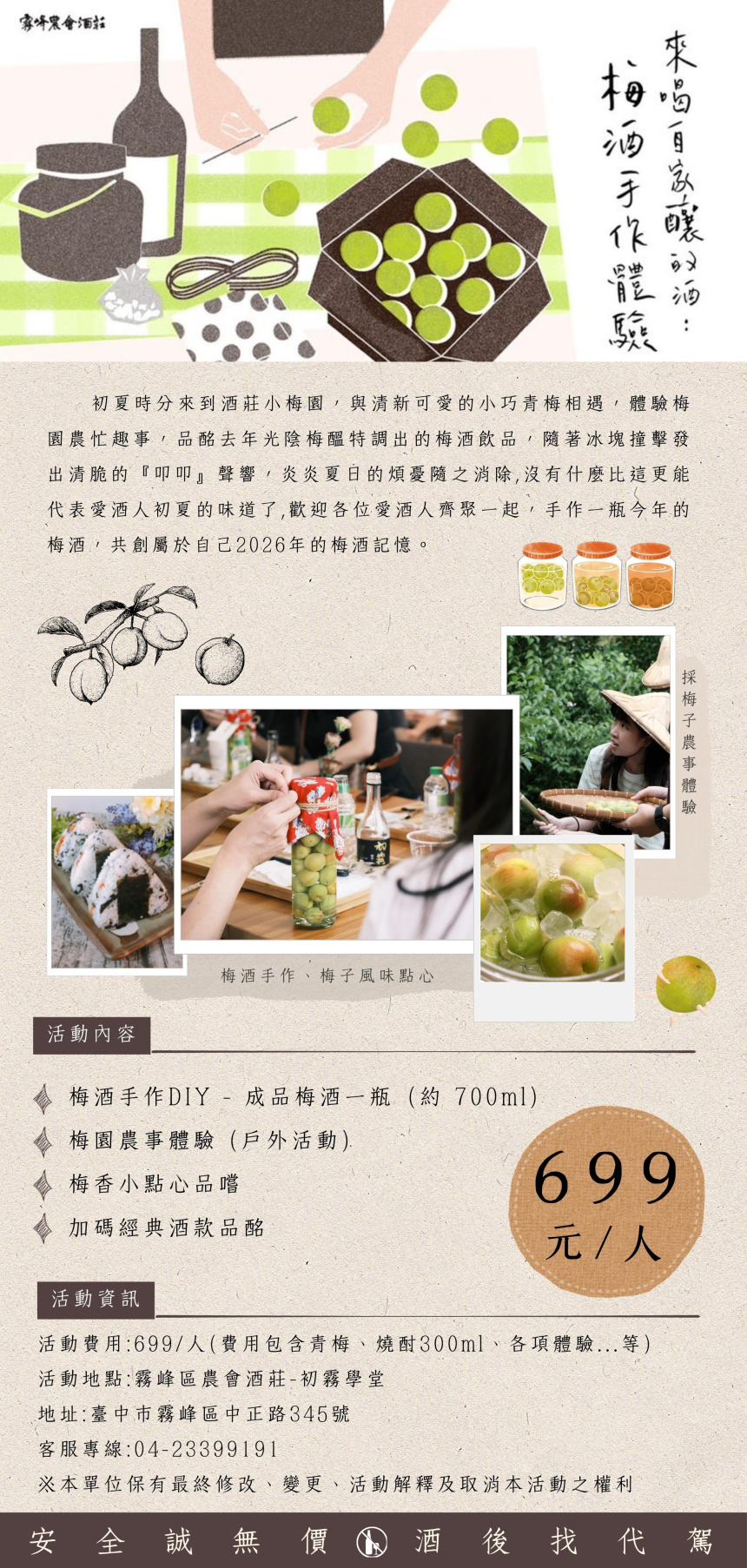 相關優惠 ▪霧峰菇類產學館享門票 優惠價50元 ▪議蘆會館住宿 享9折優惠(歡迎洽詢 04-2331-0868) ▪活動當日購買霧峰農會酒莊酒品 享酒尊貴賓價(若已為尊貴賓,另有其他限定方案)