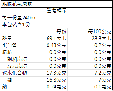 品名:龍眼花氣泡飲 成分:碳酸水、龍眼花、糖、香料 容量:240ml 產地:臺灣 保存期限:一年 有效日期:標示於罐底(西元年/月/日)
