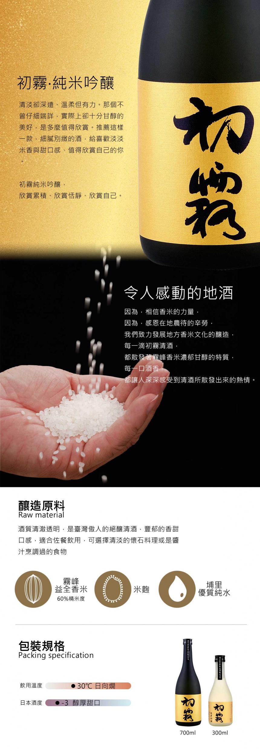 釀造原料:台中霧峰香米、米麴 口感簡述:米香淡幽、甘甜順口 精米度:60 % 酒精濃度:15 % 產品容量:700 ml/300 ml 保存方式:常溫保存,開瓶後需冷藏,請於7天內飲用完畢風味最佳。 售價: 700ML-860元 300ML-390元 購買說明:酒品依法不提供網路銷售,請洽Line@:@ppe8283o ※產品售價依通路及促銷活動公布為主 得獎事蹟: 2011-榮獲法國巴黎國際酒品評鑑-銀牌獎 2014-榮獲德國國際烈酒評鑑-銀質獎 2015-榮獲法國巴黎國際酒品評鑑-銀牌獎 2016-榮獲布魯塞爾世界酒類評鑑-金牌獎 2018-榮獲德國國際烈酒評鑑-金質獎 2020-榮獲德國國際烈酒評鑑-銀質獎 2022-榮獲美國舊金山世界烈酒大賽-銀牌獎 2023-榮獲布魯塞爾世界酒類評鑑-金牌獎 2024-榮獲法國國際酒類競賽-銀牌獎